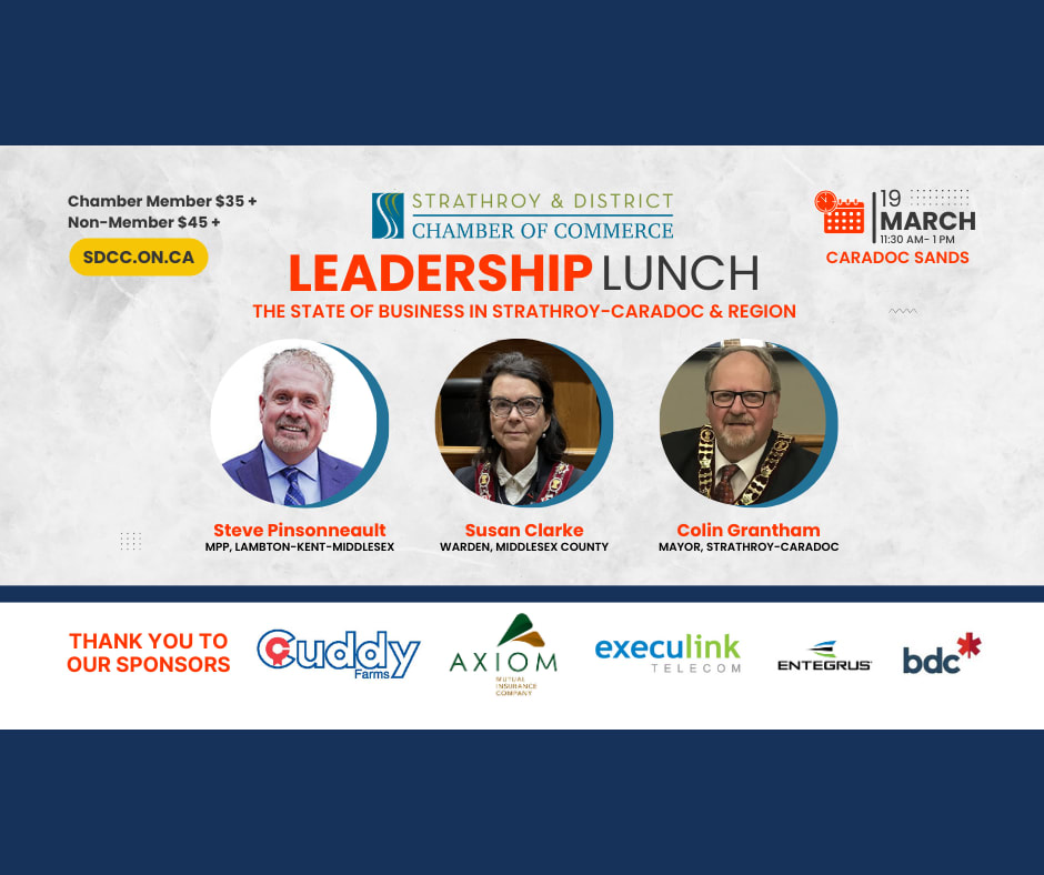 You are invited to our Leadership Lunch, a valuable opportunity to bring local business owners together with MPP Steve Pinsonneault, Warden of Middlesex County Susan Clarke, and Mayor of Strathroy-Caradoc Colin Grantham.